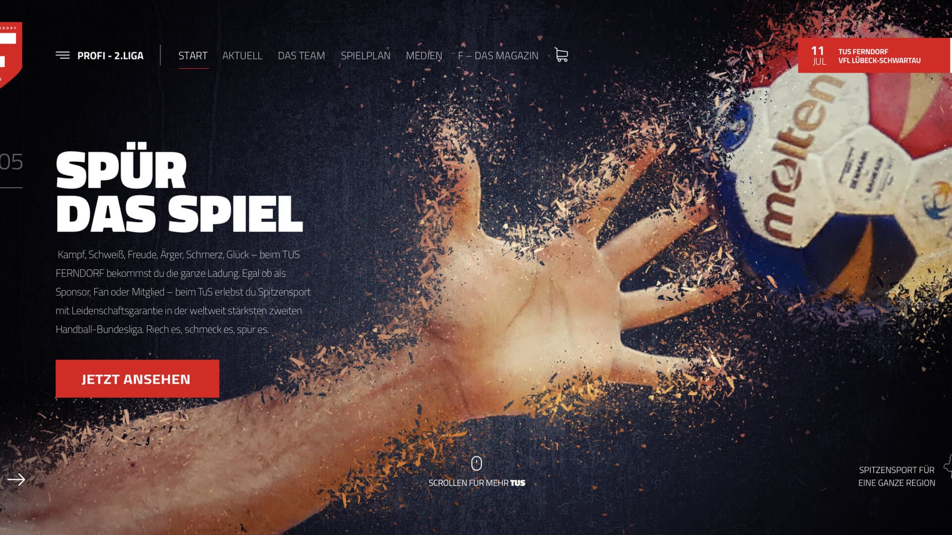 Die Signal-Farbe Rot in Verbindung mit kraftvoller Typografie und einem klaren, reduzierten Logo sollte das neue Erscheinungsbild des TuS Ferndorf ergeben. Denn weniger ist nicht nur mehr, sondern vor allem besser. Mit unseren Brand Designs wollen wir Betrachtern keine Such- oder Denksportaufgaben geben, sondern für maximal Klarheit und Einprägsamkeit sorgen. Spür das Spiel!